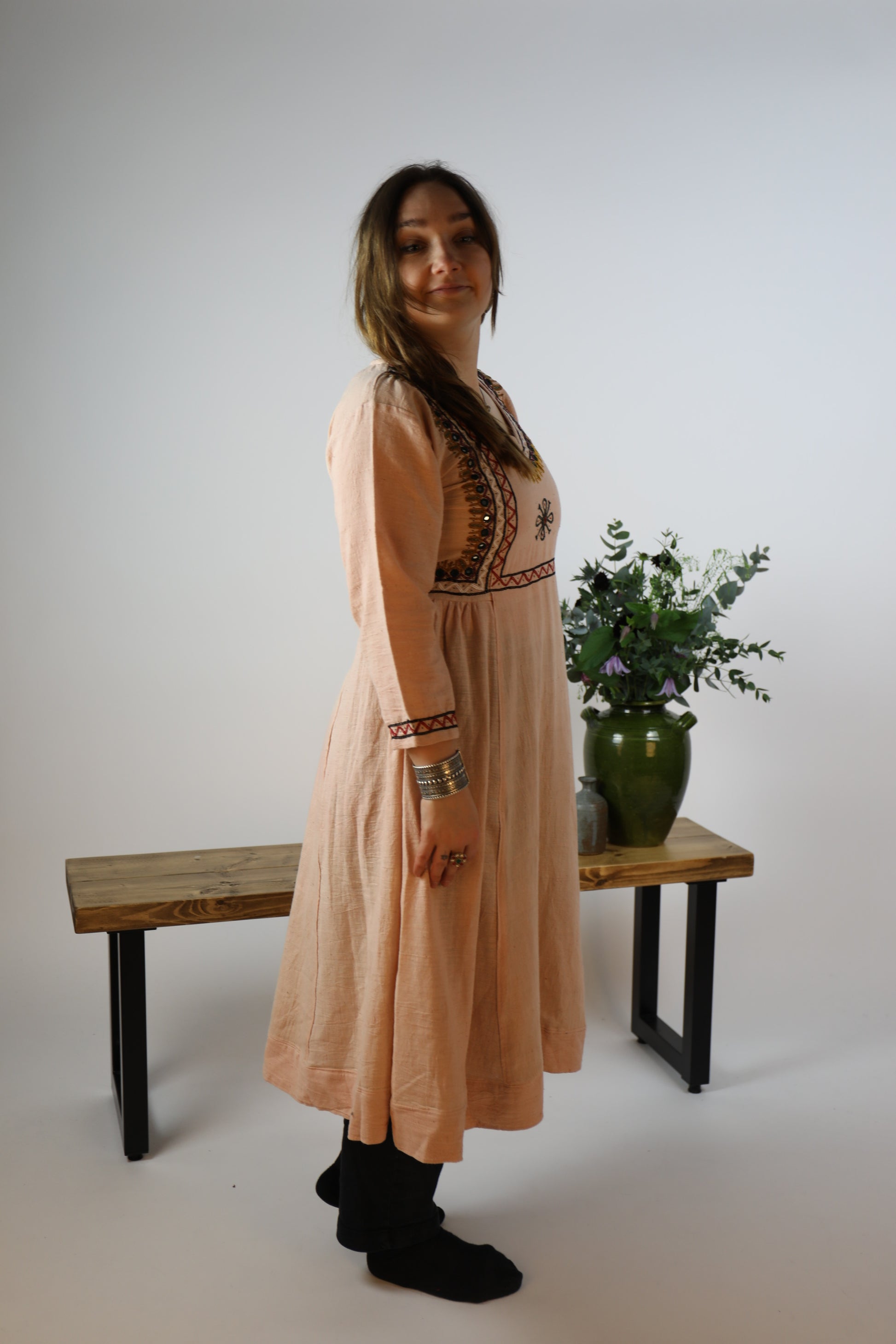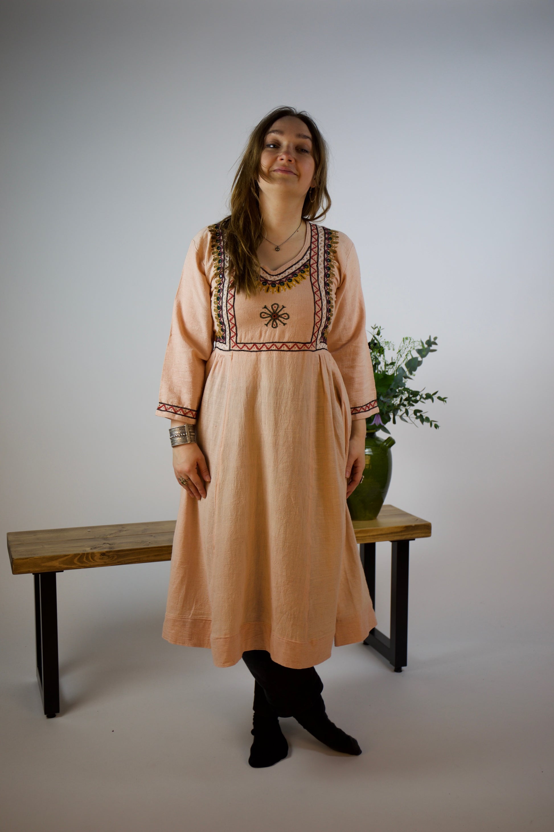 This dress is made from naturally dyed, handwoven kala cotton — a breathable, climate-resilient fabric native to Gujarat. It features intricate hand embroidery by the Dhebariya Rabari community, a nomadic pastoral group from Kutch known for their striking use of chain and back stitch in vivid contrasts on plain cloth.