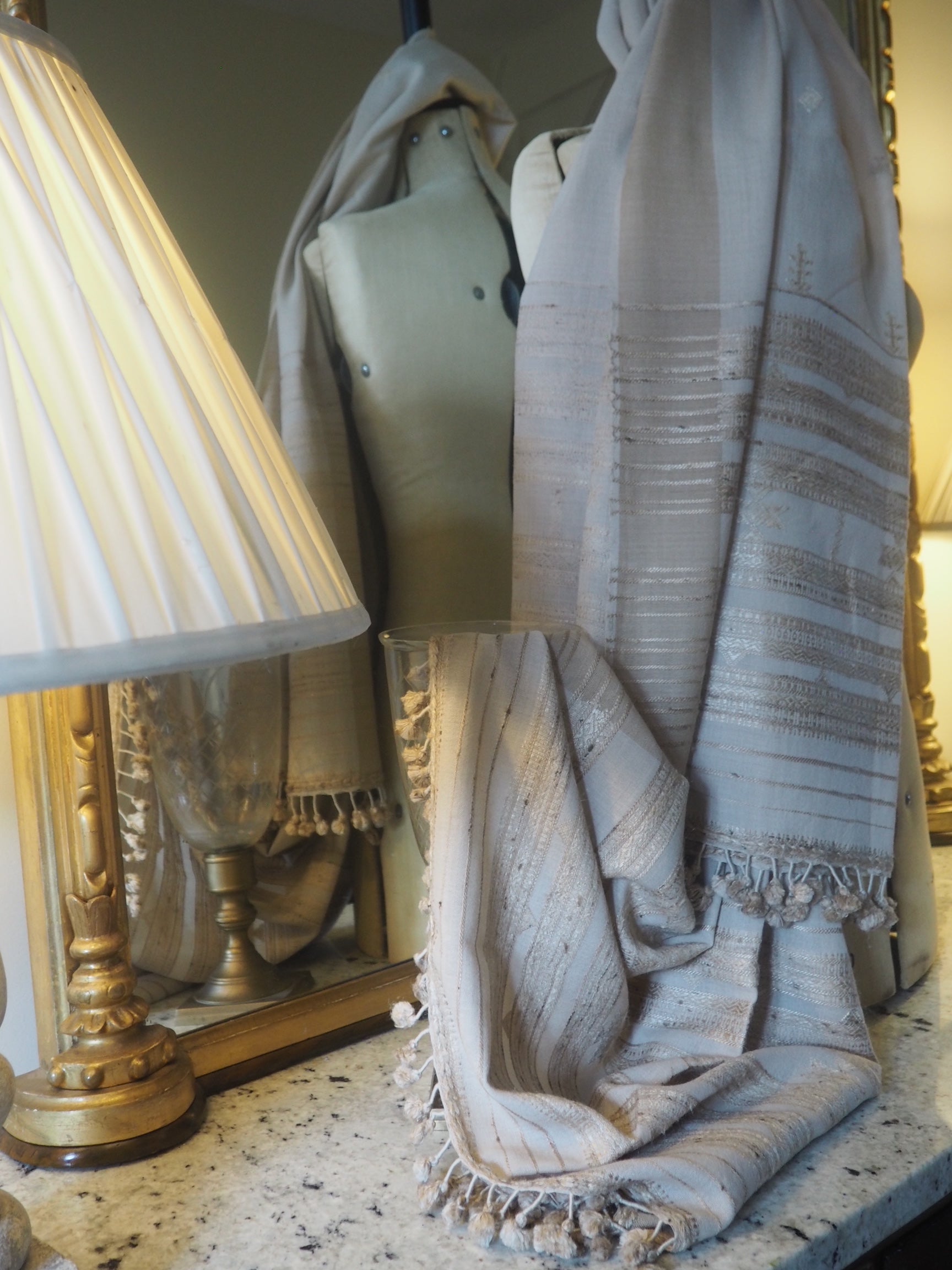 This is a beautiful pure merino wool shawl with silk tussar weft to give it weight. It's a truly luxurious piece that is sure to be your go-to when you want softness and comfort next to your skin.
