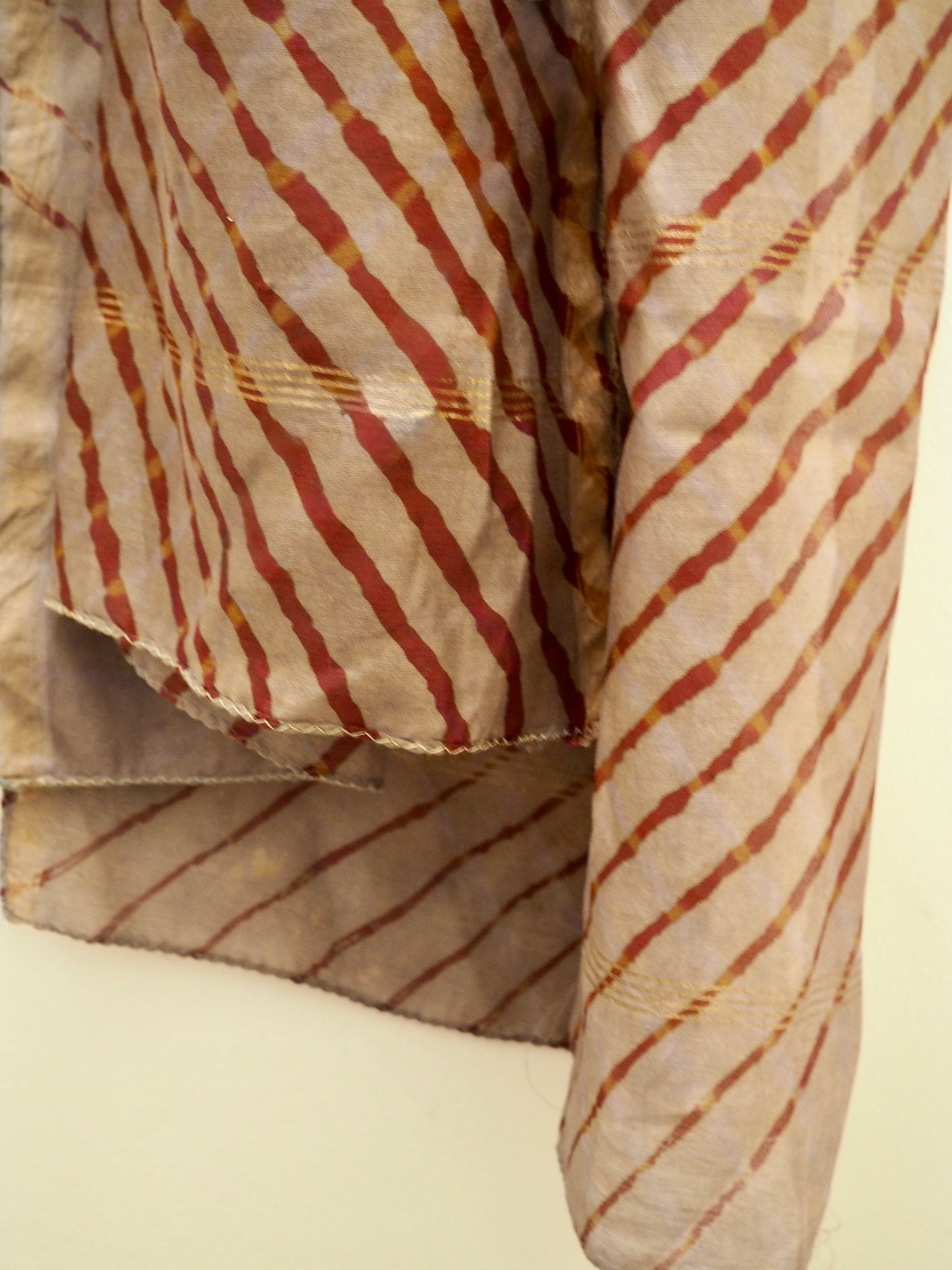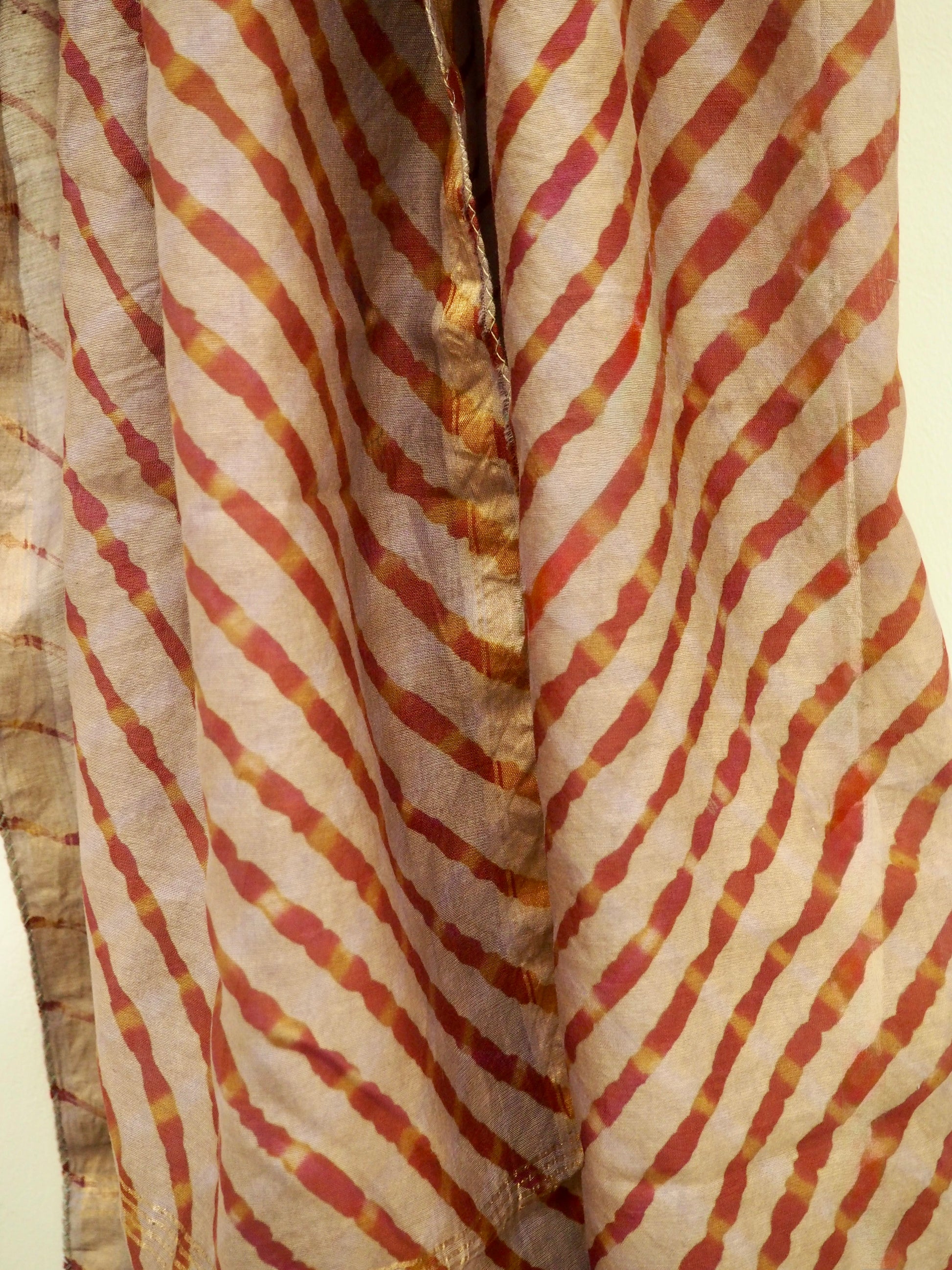 One of our purchases from artisans in Rajasthan, this grey and brown Lehera printed scarf from Rajasthan, featuring the region’s iconic wave motif. Handcrafted using traditional resist techniques, Lehera designs (or leheriya) is a traditional resist-dyed textile from Rajasthan, long associated with men’s turbans worn during the monsoon season.