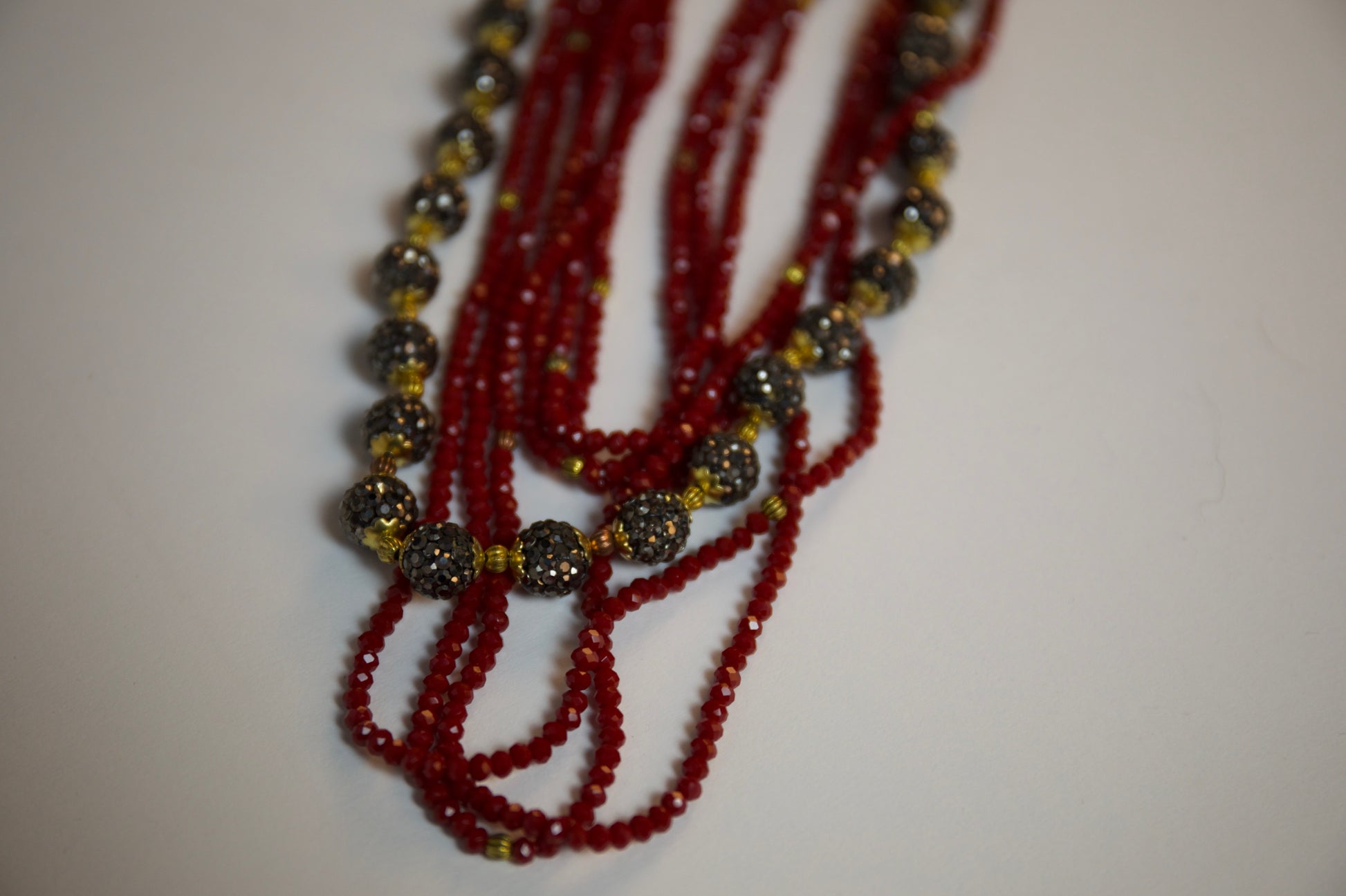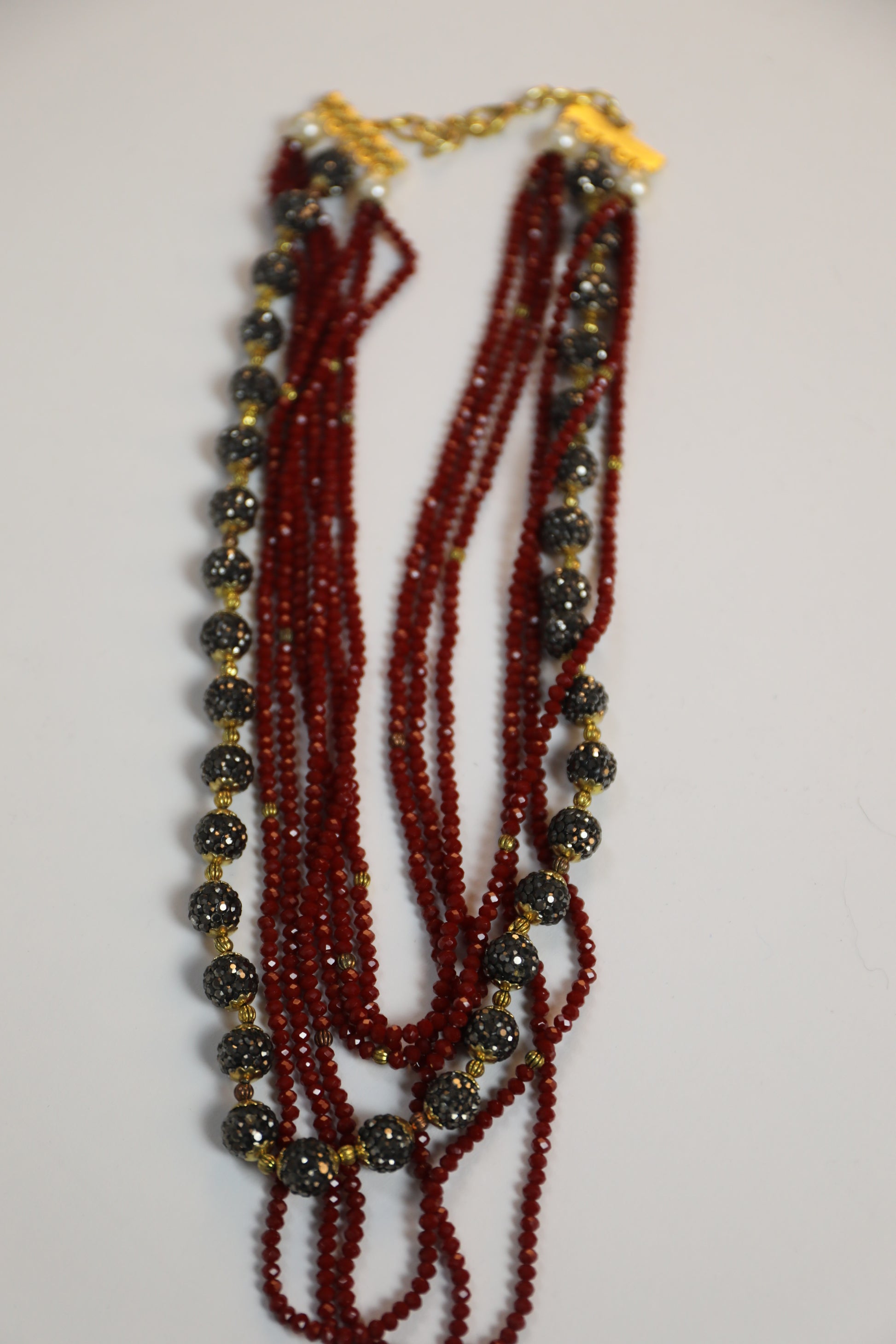 The Katharine set is one of our favourites - a mixture of glinting black beads mixed with deep red and gold. Sits at collar bone depth, approximately 16 inches.