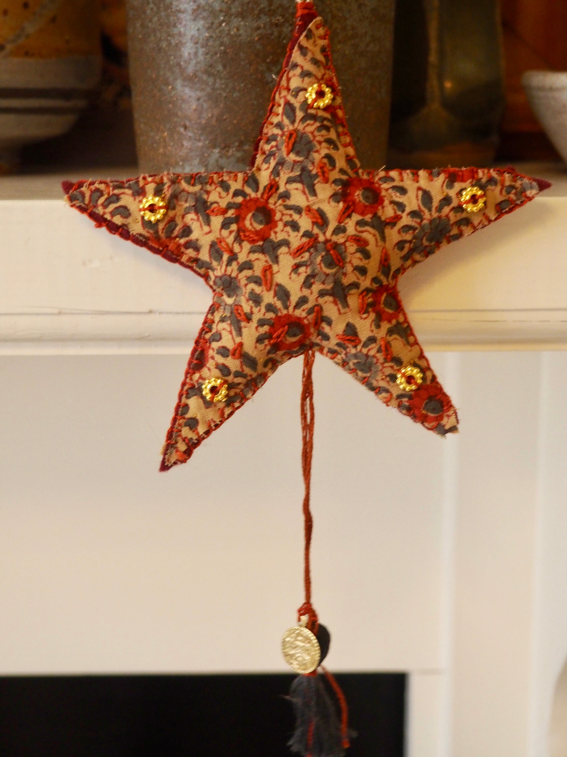 The sandlight star ornament is a sweet design with embellishments picked up on travels in India. Created with hand-printed cotton and finished with a blanket stitch. Please note, may contain small parts that are not suitable for young children.
