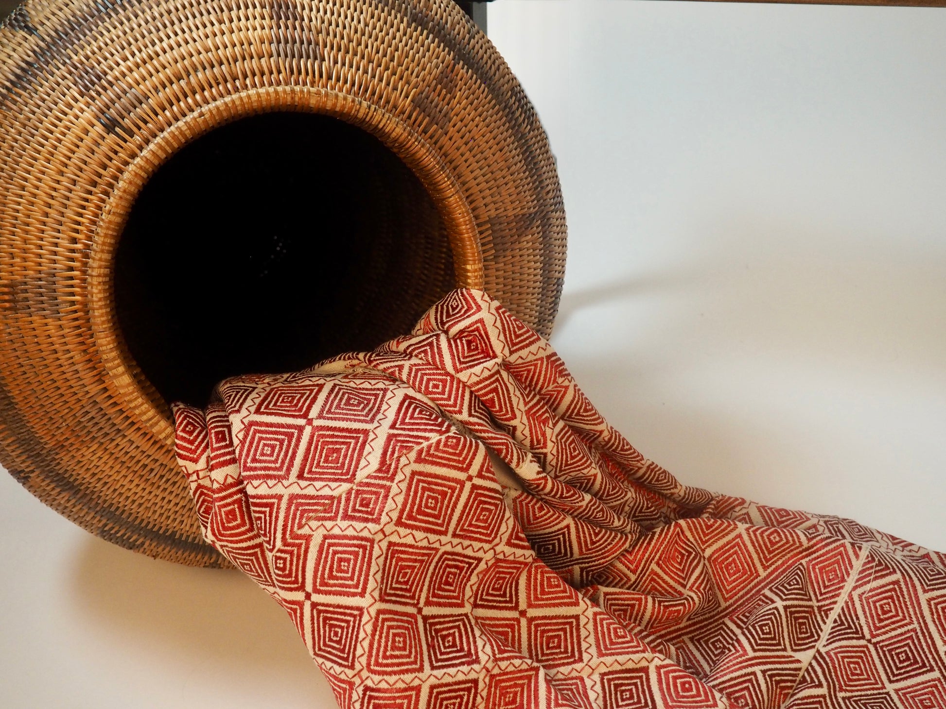 This mid-20th century shawl from Pakistan’s Swat Valley is an outstanding example of traditional counted-thread embroidery from this region known for its geometric silk floss embroidery. Created with exceptional care and most probably never worn, this is a dowry piece reflects a culture of textile artistry passed down through generations.